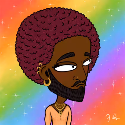 Collection Depressed Citizens Artist Juls Description ART. No team, no project, no future. Depressed Citizens is an urban & existential Art expression on Ordinals. In a parallel universe, "THEI" control us. DC unites against toxic society, encouraging critical thinking. 100% hand made collection that took Juls more than 6 months of daily work. Name Citizen#482 Origin LGBT-Q+ Gender Non-binary Necklace Gold layered necklace Hat No Hat Mustache Beard Garibaldis beard Glasses No Glasses Earrings Helix ring trio Hair Style Afro Clothes Peach deep v-neck shirt Tattoo No Tattoo Star Background With stars
