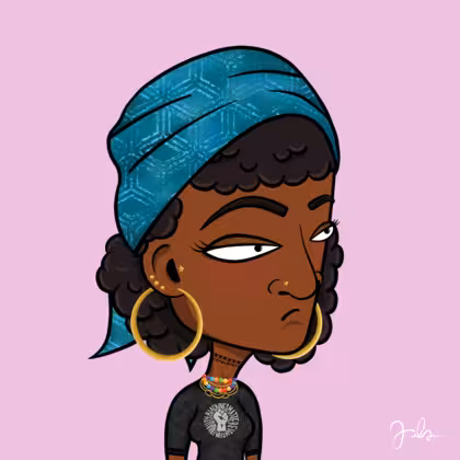 Collection Depressed Citizens Artist Juls Description ART. No team, no project, no future. Depressed Citizens is an urban & existential Art expression on Ordinals. In a parallel universe, "THEI" control us. DC unites against toxic society, encouraging critical thinking. 100% hand made collection that took Juls more than 6 months of daily work. Name Citizen#2475 Origin African descendant Gender Woman Necklace Colorful layered necklace Hat Printed head scarf Mustache Beard No beard Glasses No Glasses Earrings Tragus star earring Hair Style Curly Clothes BLM women shirt Tattoo No Tattoo Star Background Without stars