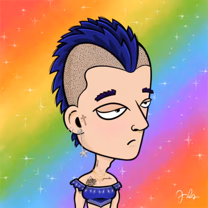 Collection Depressed Citizens Artist Juls Description ART. No team, no project, no future. Depressed Citizens is an urban & existential Art expression on Ordinals. In a parallel universe, "THEI" control us. DC unites against toxic society, encouraging critical thinking. 100% hand made collection that took Juls more than 6 months of daily work. Name Citizen#2470 Origin LGBT-Q+ Gender Non-binary Necklace Gold layered necklace Hat No Hat Mustache Beard No beard Glasses No Glasses Earrings Upper lobe rings Hair Style Punk Mohawk Clothes Blue bandana crop top Tattoo Blessed tattoo Star Background With stars