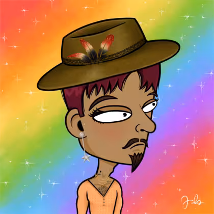Collection Depressed Citizens Artist Juls Description ART. No team, no project, no future. Depressed Citizens is an urban & existential Art expression on Ordinals. In a parallel universe, "THEI" control us. DC unites against toxic society, encouraging critical thinking. 100% hand made collection that took Juls more than 6 months of daily work. Name Citizen#2101 Origin LGBT-Q+ Gender Non-binary Necklace Gold layered necklace Hat Fedora hat Mustache Beard Handlebar & chin puff Glasses No Glasses Earrings Star earring set Hair Style Short pixie Clothes Peach deep v-neck shirt Tattoo Rose tattoo Star Background With stars