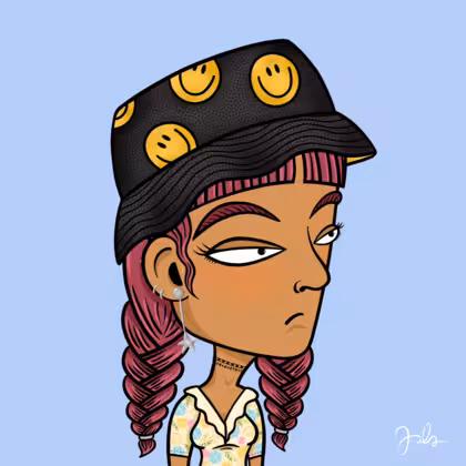 Collection Depressed Citizens Artist Juls Description ART. No team, no project, no future. Depressed Citizens is an urban & existential Art expression on Ordinals. In a parallel universe, "THEI" control us. DC unites against toxic society, encouraging critical thinking. 100% hand made collection that took Juls more than 6 months of daily work. Name Citizen#20 Origin Hispanic Gender Woman Necklace Choker Hat Smiley bucket hat Mustache Beard No beard Glasses No Glasses Earrings Upper lobe rings Hair Style Double braids with bangs Clothes Spring flowers v-neck shirt Tattoo No Tattoo Star Background Without stars