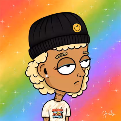 Collection Depressed Citizens Artist Juls Description ART. No team, no project, no future. Depressed Citizens is an urban & existential Art expression on Ordinals. In a parallel universe, "THEI" control us. DC unites against toxic society, encouraging critical thinking. 100% hand made collection that took Juls more than 6 months of daily work. Name Citizen#254 Origin LGBT-Q+ Gender Non-binary Necklace Choker Hat Smiley beanie Mustache Beard No beard Glasses No Glasses Earrings Ball earrings trio Hair Style Curly Clothes Take it easy oversized T-shirt Tattoo Rose tattoo Star Background With stars